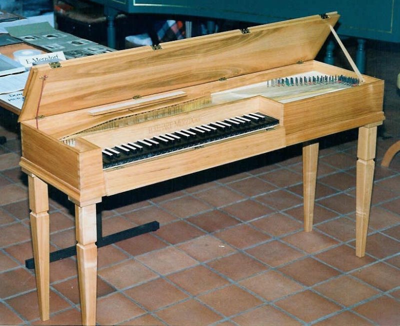 Clavichord after Christian Gottlob Hubert, Ansbach 1787, 1,40m long, compass AA - f³, with brass strings, tuning pitch a' 415 Hz, fretted, although a + d are unfretted, the bass is unfretted as of the kl d, naturals with ebony key-tops, sharps in ebony with bone key-tops, four unscrewable legs